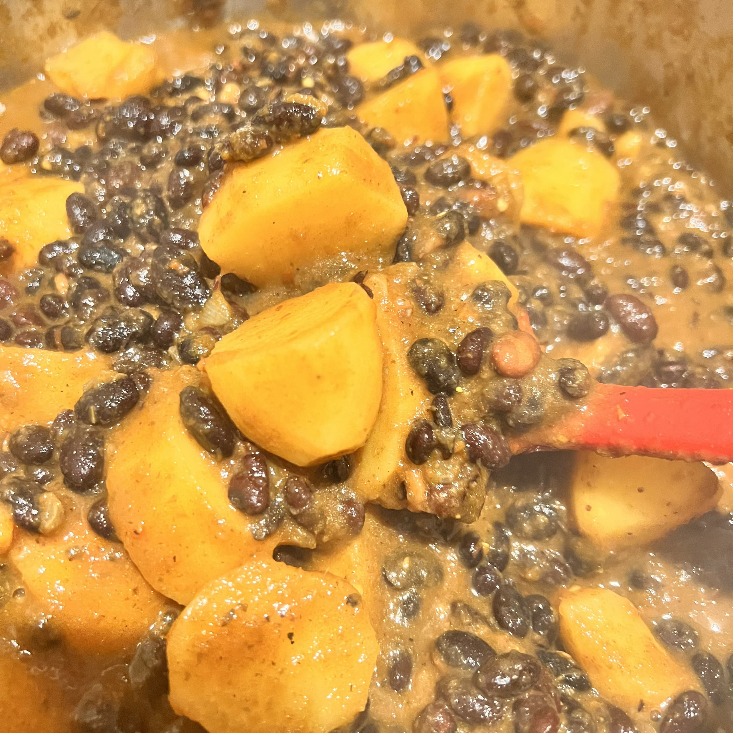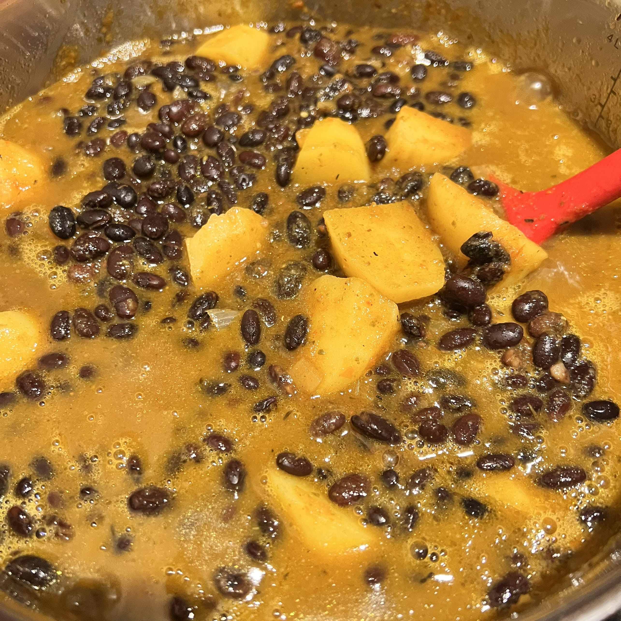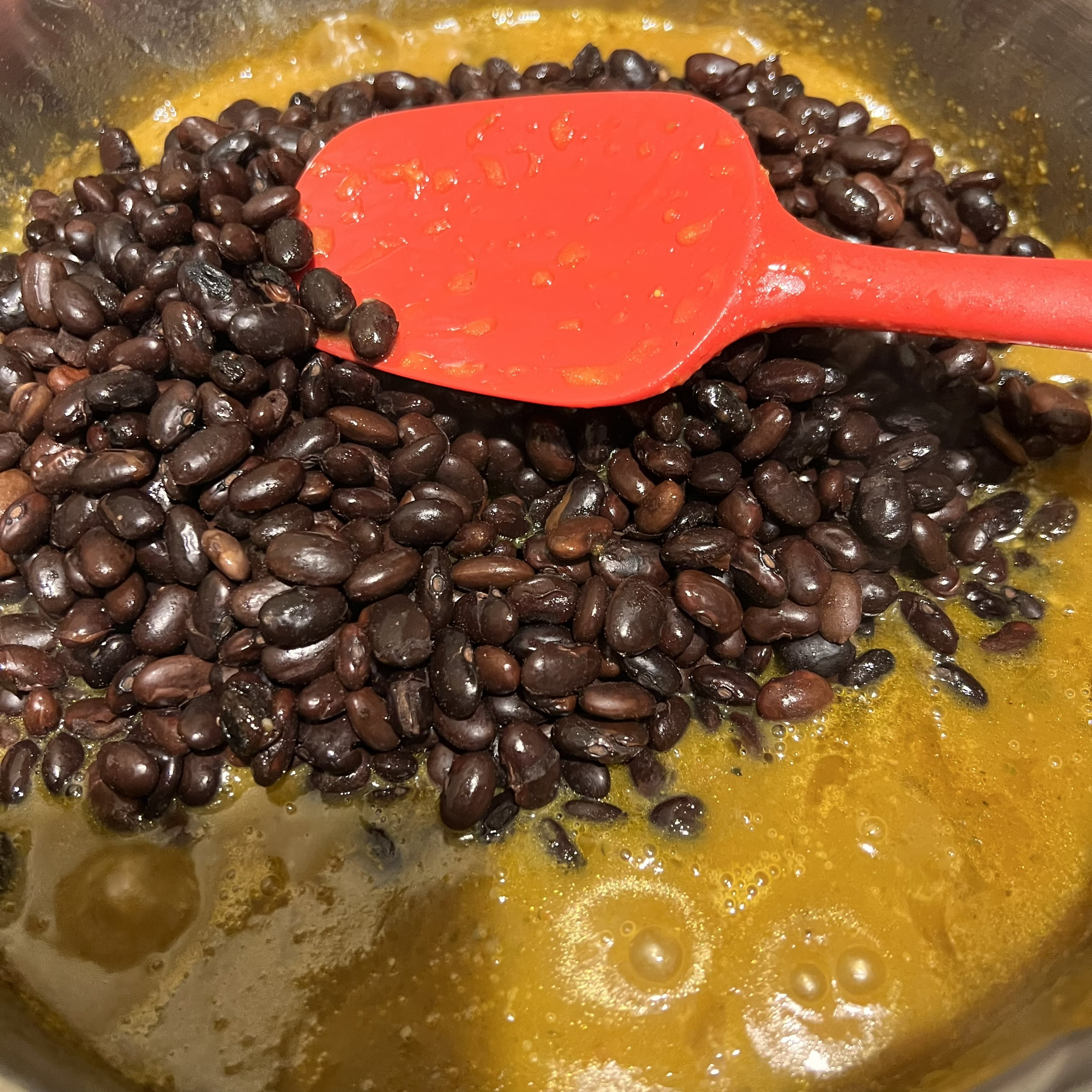 Once the potatoes are soft, fold in the cooked beans and give it a nice stir.