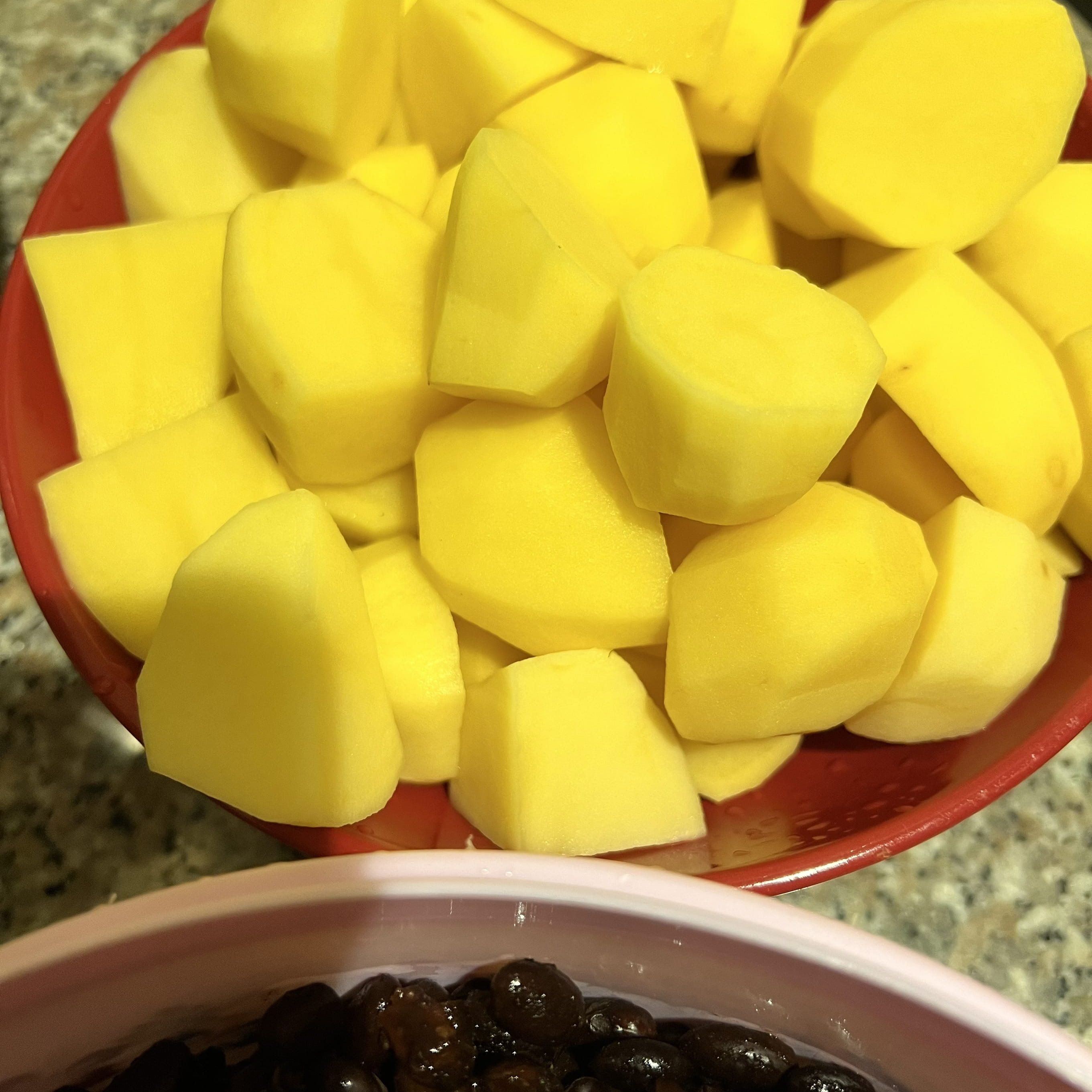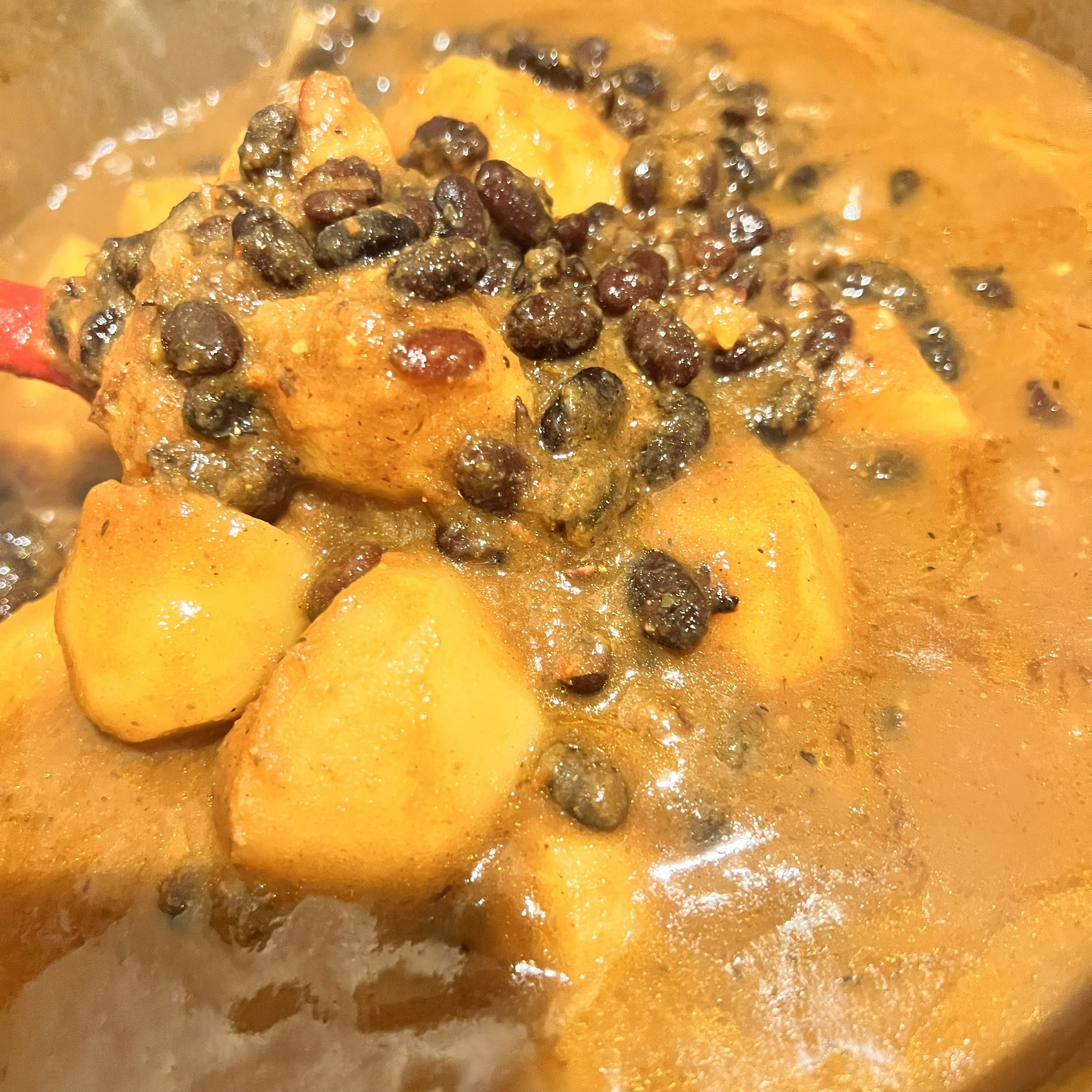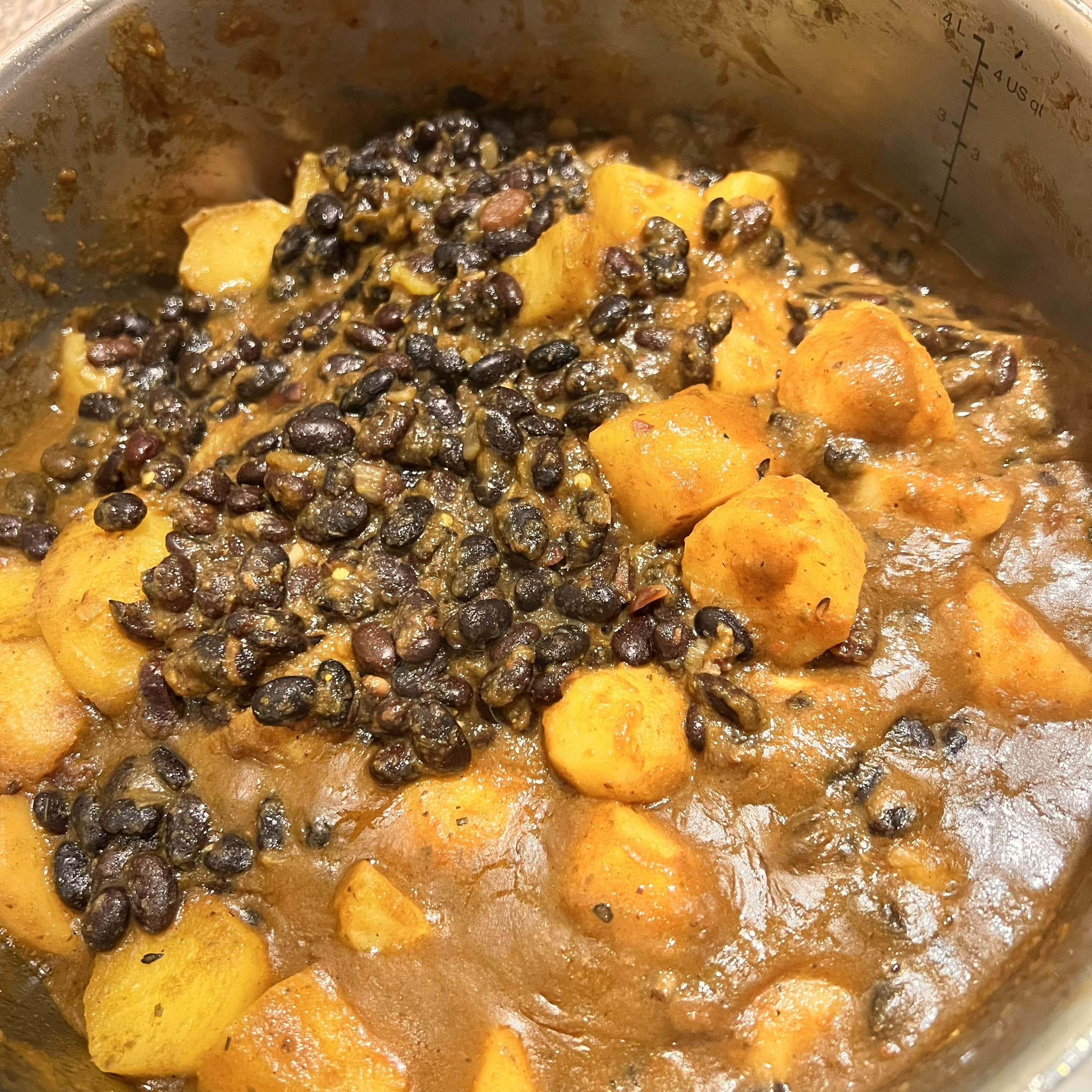 Once the potatoes are soft, fold in the cooked beans and give it a nice stir.