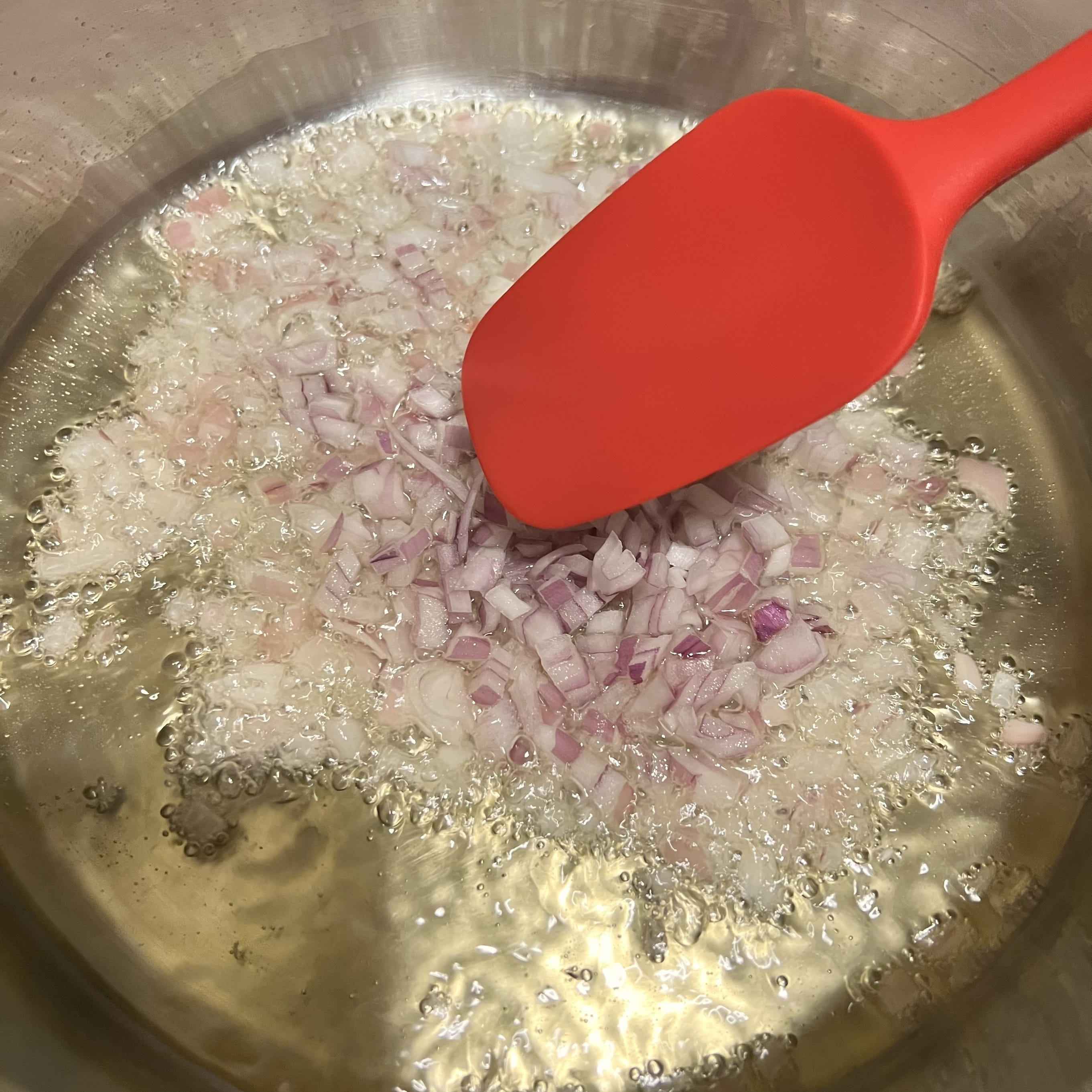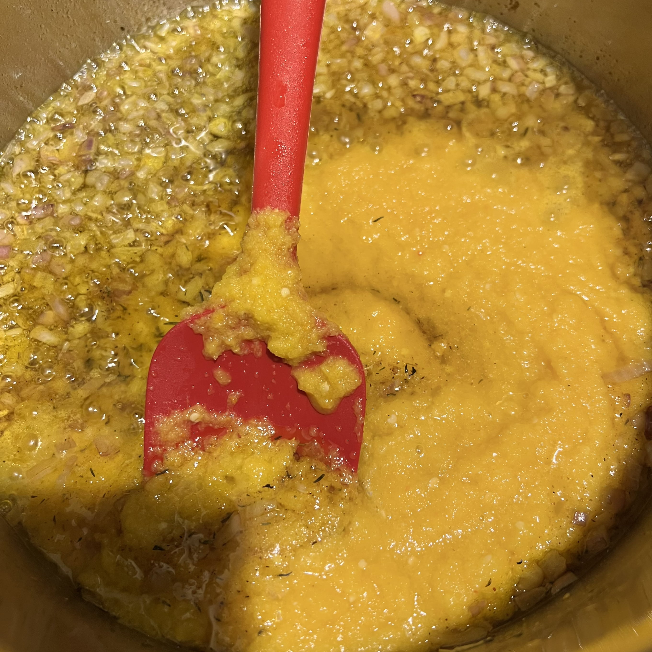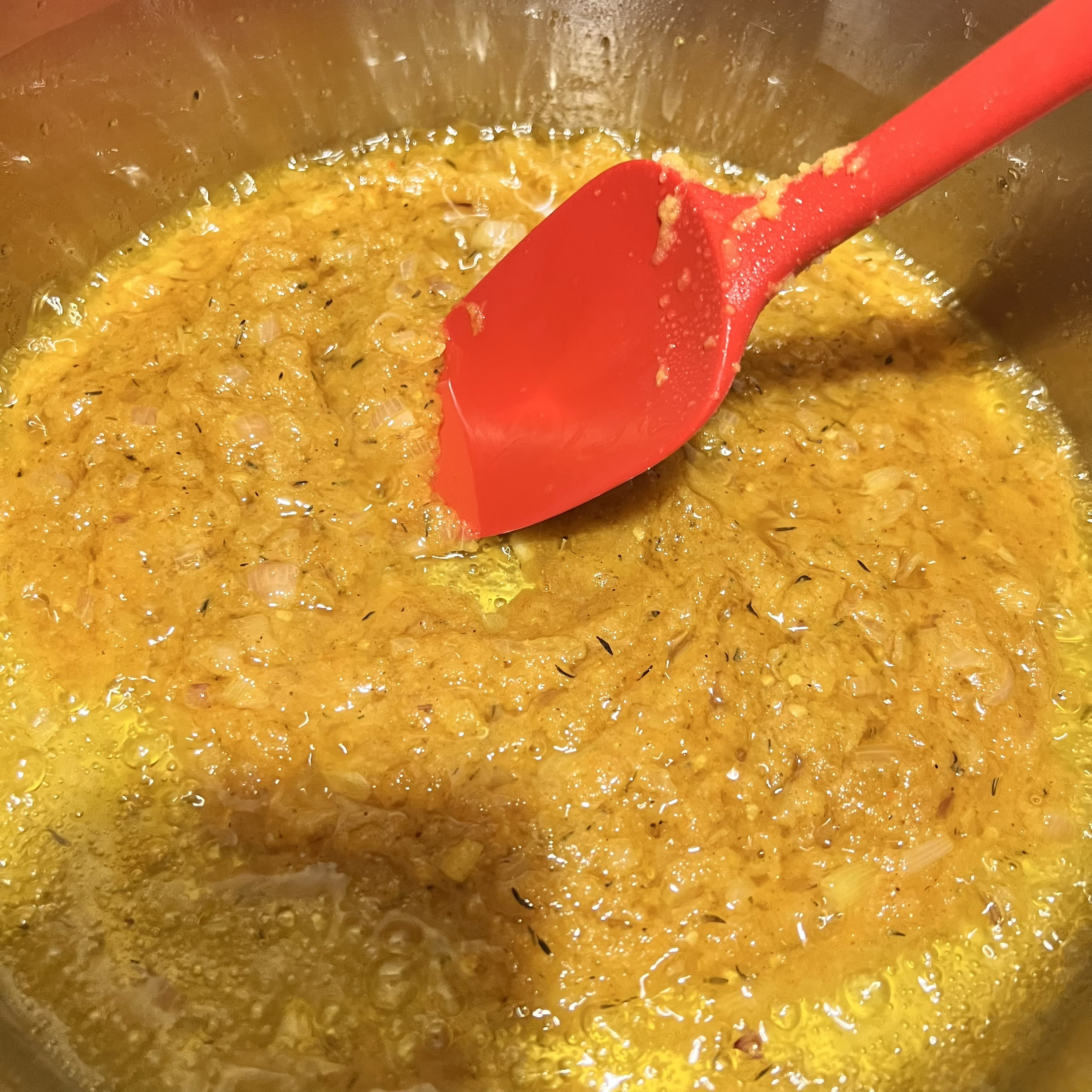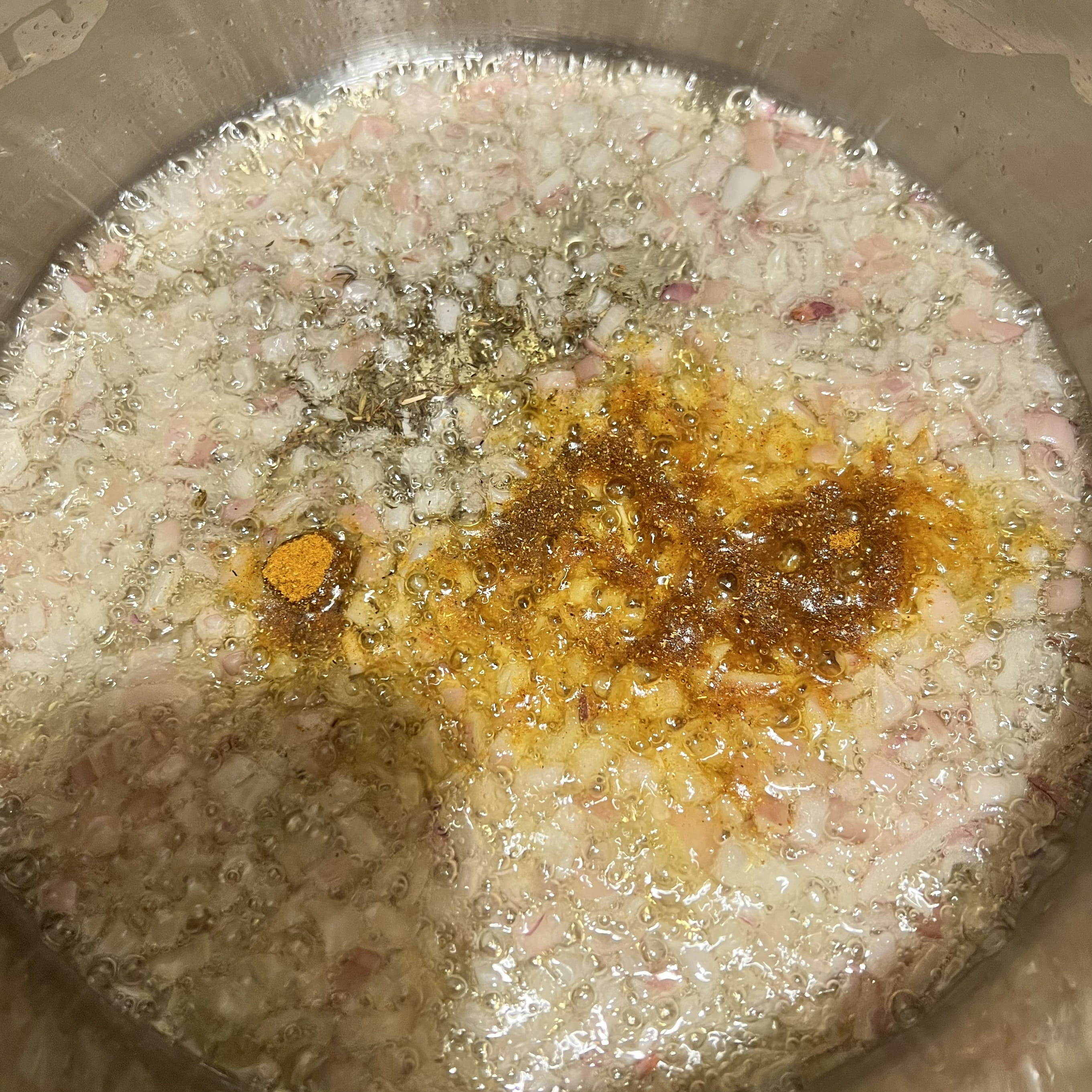 Add some oil in a heavy-bottom pot. Use low heat to fry the chopped onion. Stir in the curry and thyme.