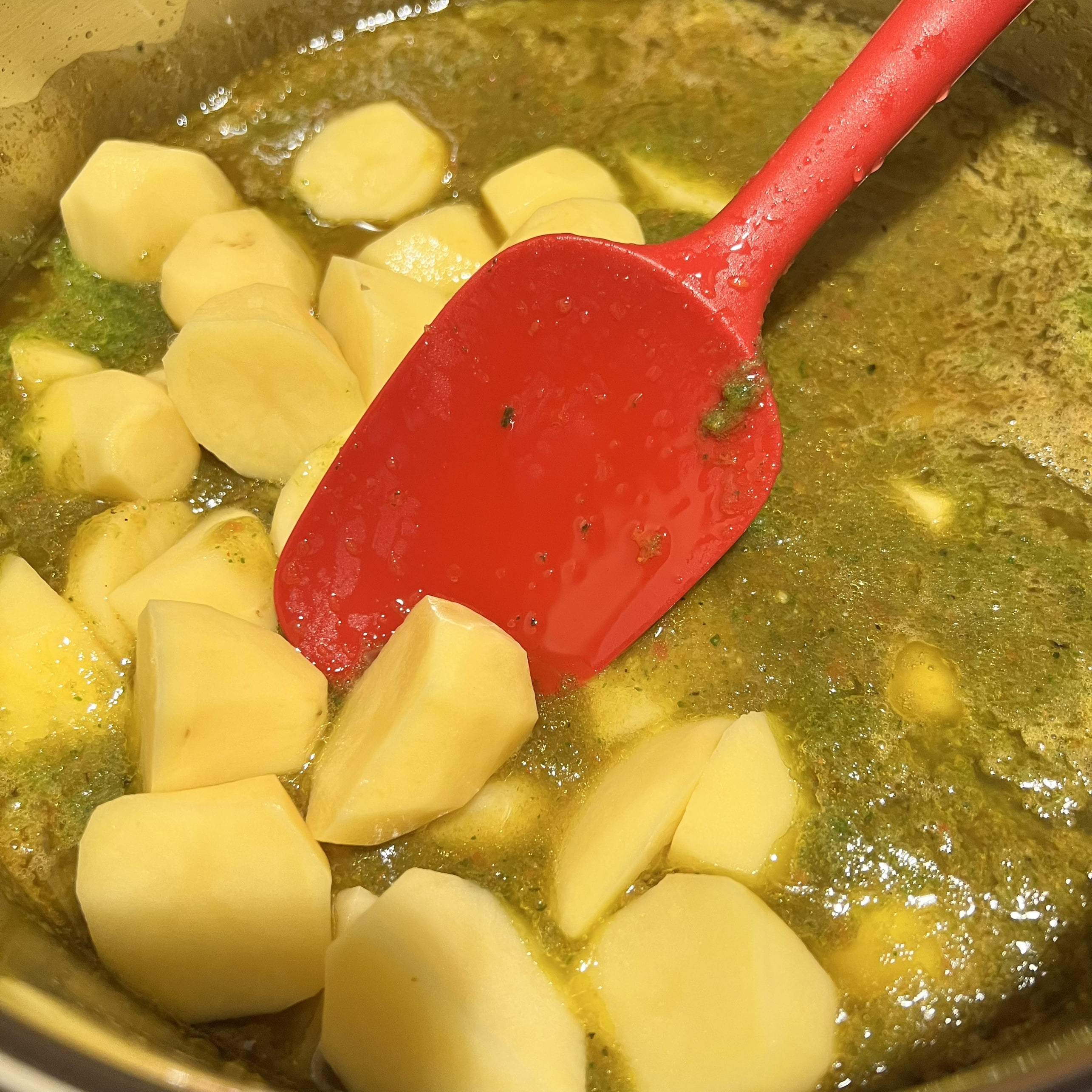 Add the red mixture and stir. Check if the salt is enough. If it is enough, cover and let the potatoes cook on medium-high heat until they are soft.